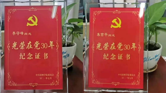 李书记为两位党员颁发“光荣在党30年”纪念证书,并表示:在建党100周年之际,颁发“光荣在党30年”纪念证书,体现了以习近平同志为核心的党中央对老党员的关怀关心和牵挂,希望两位同志继续发挥先锋模范作用,为推进学院发展建言献策,分享宝贵经验,引导年轻党员继承优良传统、汲取奋进力量,助力学院建设发展。