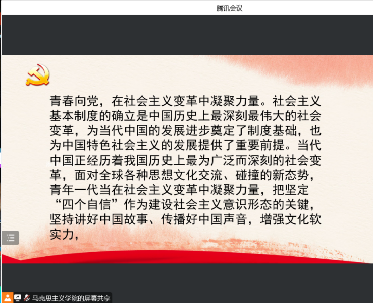 在会议中,通过视频、文章等个形式学习各个青春模范的典型事迹。各位党员在学习后,纷纷积极发言。毕征远表示,树高千尺必有根,水流万里也有源。人民群众是历史的创造者,是社会主义建设事业的力量源泉,人民立场是我们党一贯坚持的根本政治立场。面对世界百年未有之大变局,成长于社会主义中国的大地上,青年的发展与国家和人民的命运须臾不可分离。