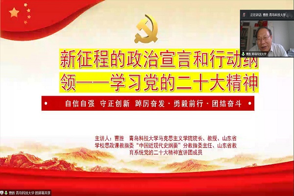 为深入学习贯彻落实中国共产党第二十次全国代表大会精神,及时将党的二十大精神融入思政课教学和科研,11月18日下午,马克思主义学院邀请青岛科技大学马克思主义学院院长曹胜教授作《新征程的政治宣言和行动纲领——学习党的二十大精神》专题报告,报告由院长傅开梅教授主持。