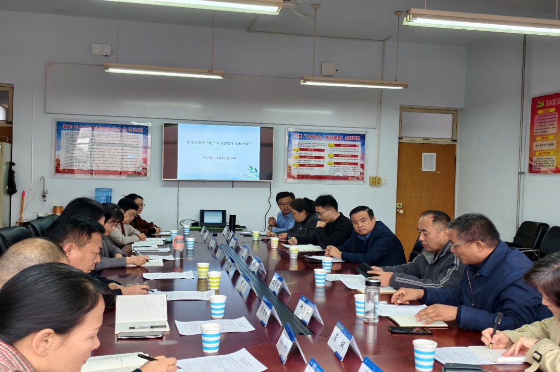 我院概论教研室主任邢乃华博士作主题学术报告。报告围绕逆全球化风潮下资本主义的“危”与马克思主义的“机”展开,详细梳理了资本主义从自由资本主义、垄断资本主义、晚期资本主义到新自由主义资本主义的发展过程,并对资本主义难以克服的危机、理论矛盾进行了深入剖析。邢博士认为,马克思主义以实现人的全面而自由的发展为目标,通过处理社会与“国家+”的关系而构建了严密的理论体系;同时,马克思主义中国化时代化的最新理论成果对当今资本主义的“危”进行了深刻的反思、批判,并立足现实,贯通历史、当下和未来,提出的一系列深刻洞见和主张,具有深远的预见力、强大的解释力、持久的创造力和非凡的锻造力,为推动解决当今世界治理难题拓展了广阔空间。